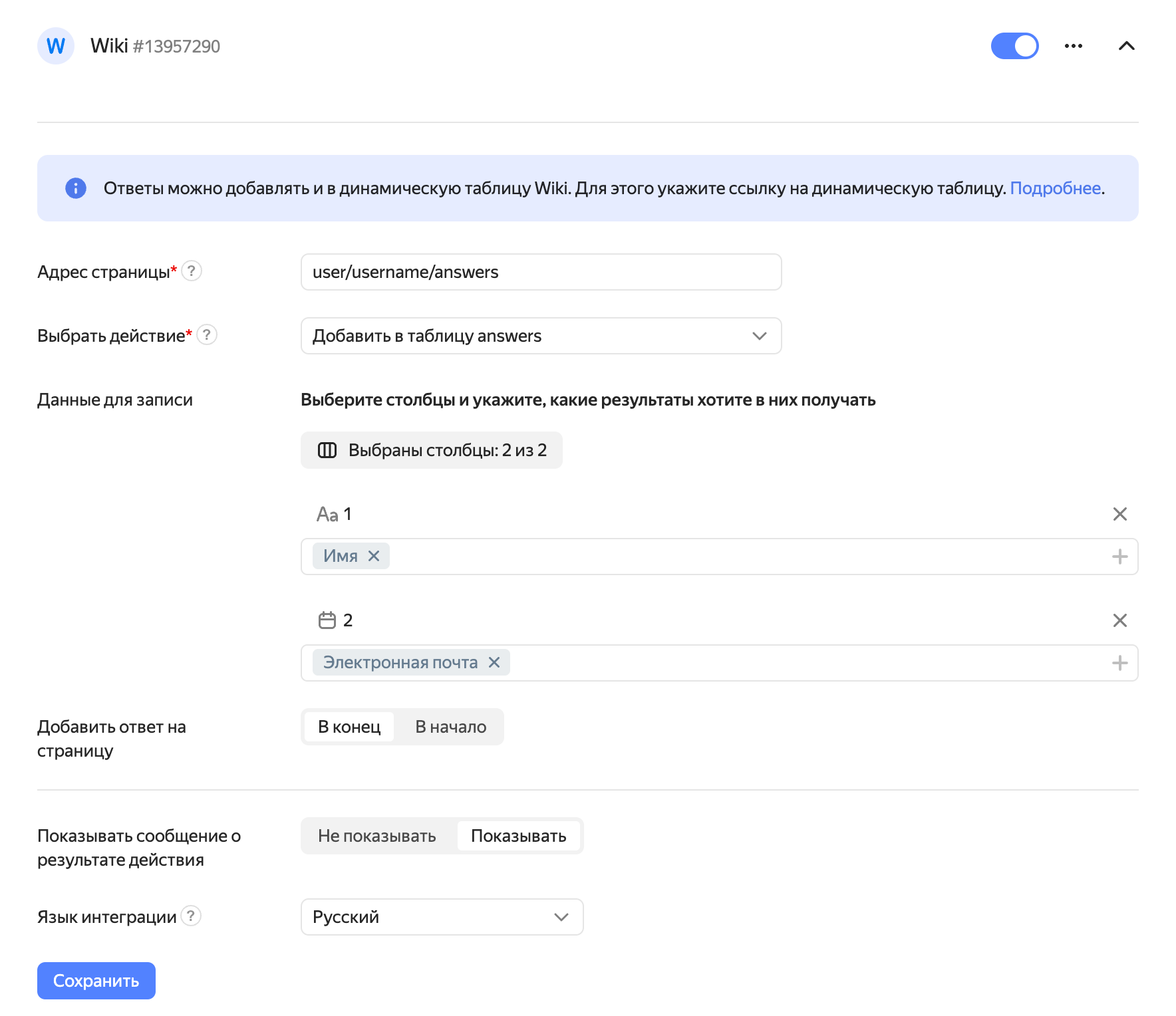 Чтобы настроить добавление ответов из формы в динамическую таблицу Вики:
