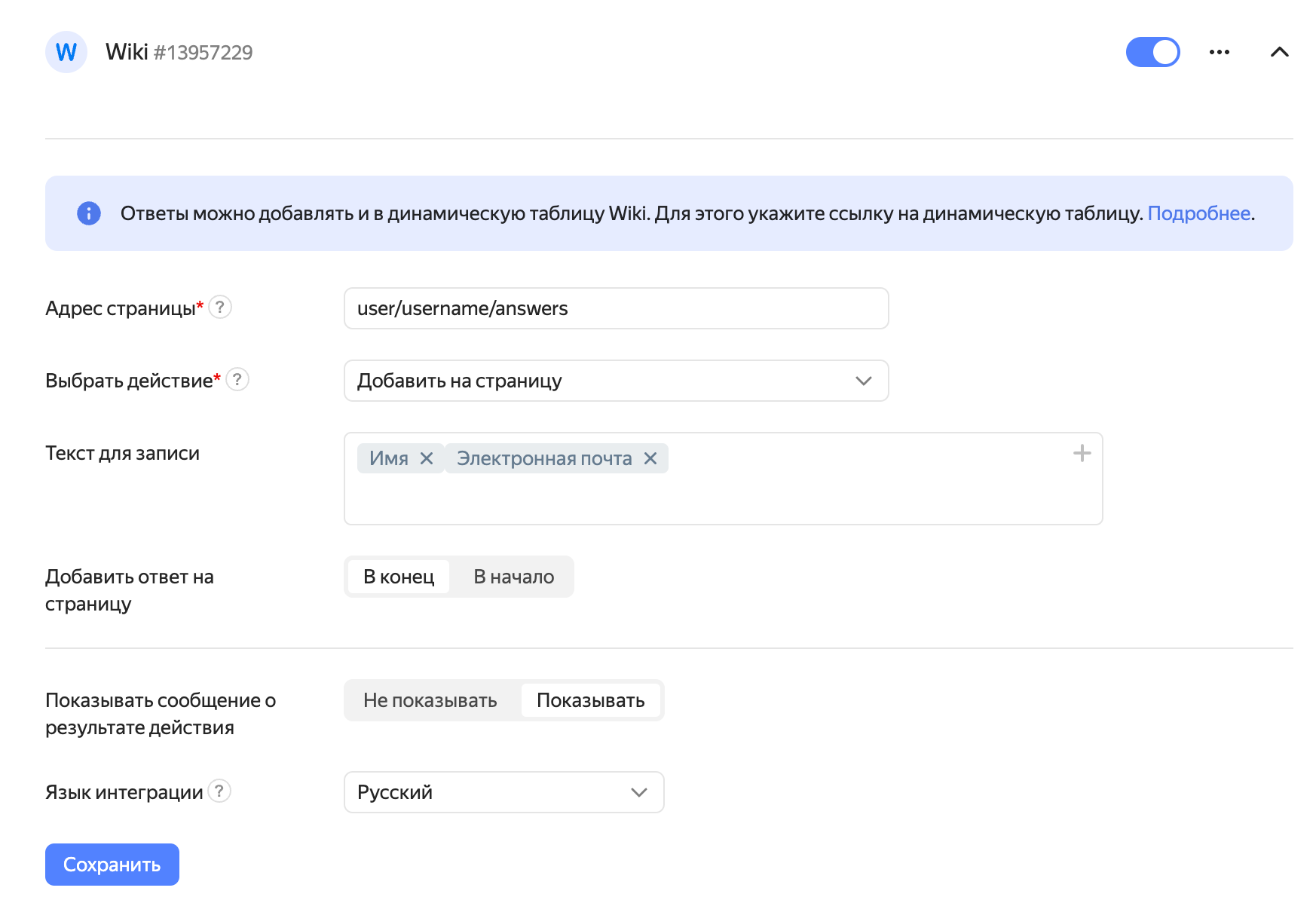 В форме можно настроить интеграцию с Вики, чтобы сохранять ответы пользователей на вики-странице. Например, если вы используете форму для регистрации участников мероприятия, можно автоматически сохранять список участников на Вики. Подробнее о вики-страницах читайте в документации Вики.