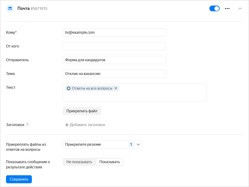 Чтобы после заполнения формы показать пользователю сообщение об отправленном письме, под заголовком действия включите опцию Показывать сообщение о результате действия.