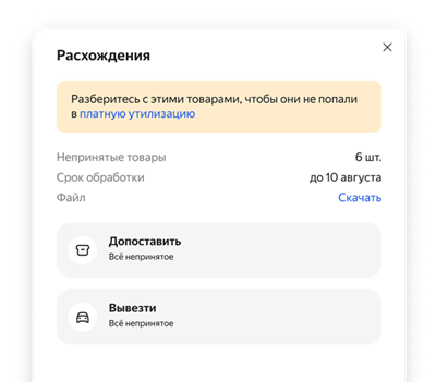 Rejected goods, for example, without labels or damaged ones, will not get into the showcase and will not be able to be sold. To find out why the product was not accepted and if anything can be done to make it available for sale, download List of products in the block Documents.