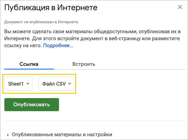 Чтобы получить ссылку на CSV файл из Google Таблиц: