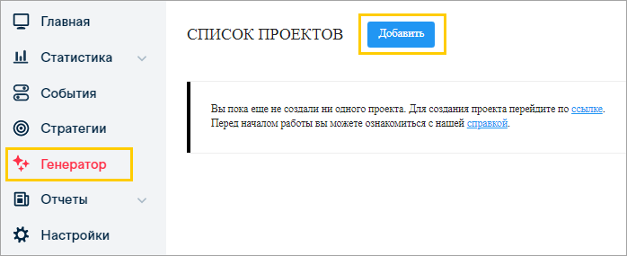 После того, как вы создали проект в личном кабинете, откройте раздел Генератор и нажмите кнопку Добавить.