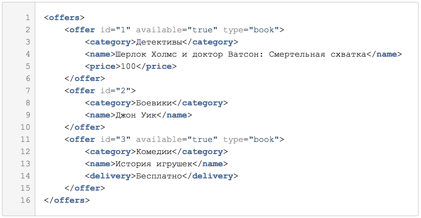 - Если фид в формате xml\yml, проверьте структуру фида. Офферы должны содержаться внутри соответствующего тега, но не вне тега и не внутри другого тега.
