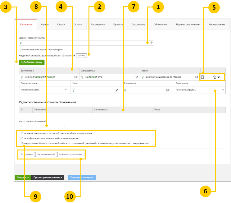 Нажмите Добавить строку и запишите в новую строку шаблон для текста объявлений. -