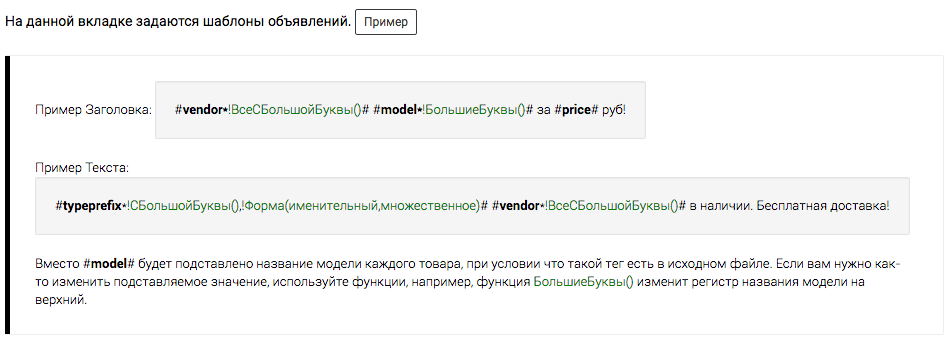 Чтобы посмотреть пример шаблона для заголовка и текста объявления, нажмите Пример.