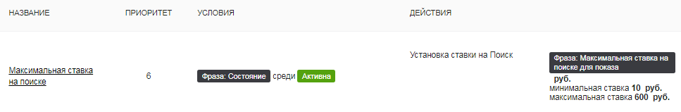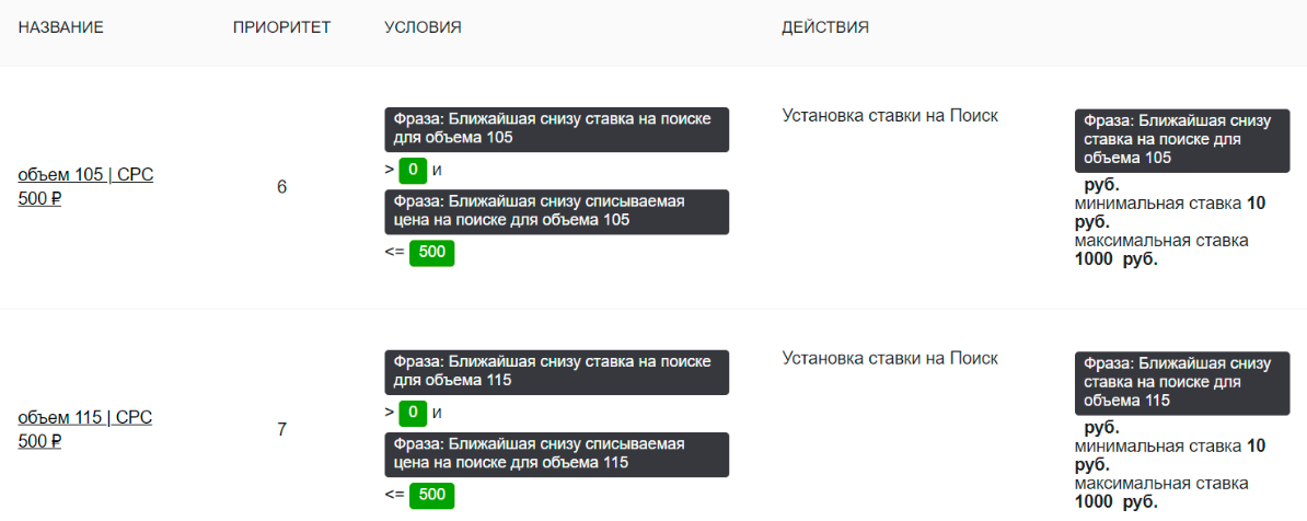 Если есть ограничение по стоимости клика, настраиваем каскад правил. В условиях правил задаем, что списываемая цена за объем трафика не превышает нужный СРС, и ставка больше нуля.