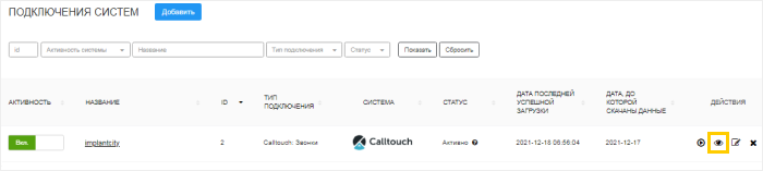 Далее нажмите кнопку Добавить рядом с подключением систем. Из выпадающего списка выберите — Calltouch и нажмите Авторизовать Calltouch в K50 Паспорт.