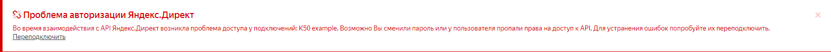 Ошибка авторизации означает, что ваш рекламный аккаунт не может подключиться к K50. Возможно, вы изменили пароль или настройки прав доступа, или закончился срок действия токена.