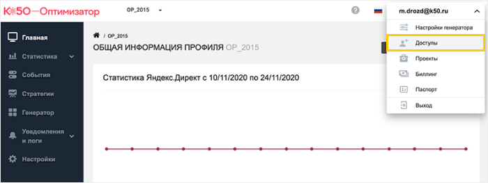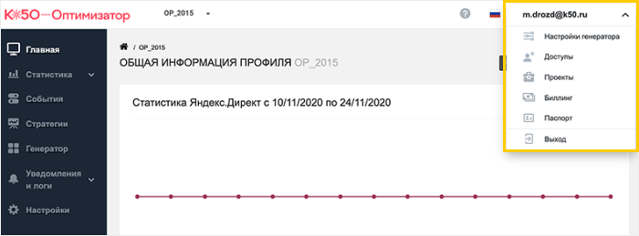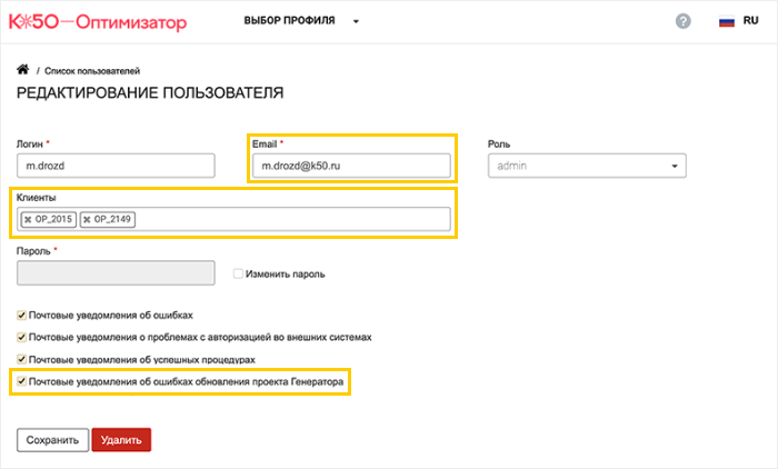 В режиме редактирования пользователя находится опция Почтовые уведомления об ошибках обновления проекта Генератора. При возникновении ошибок обновления фидов в проектах Генератора, на почту пользователя отправляется уведомление.