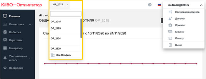 В выпадающем меню отображаются все доступные проекты (профили) инстанса (клиенты).