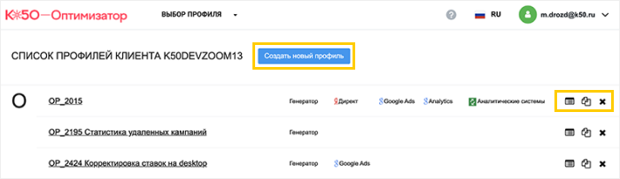 В выпадающем списке выберите Все Профили. Доступные действия над профилем клиента:
