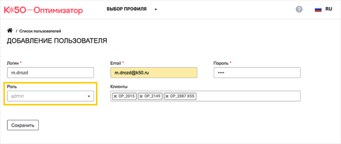 Для смены пользователя выйдите из K50 и войдите под другим логином, зарегистрированном в системе.