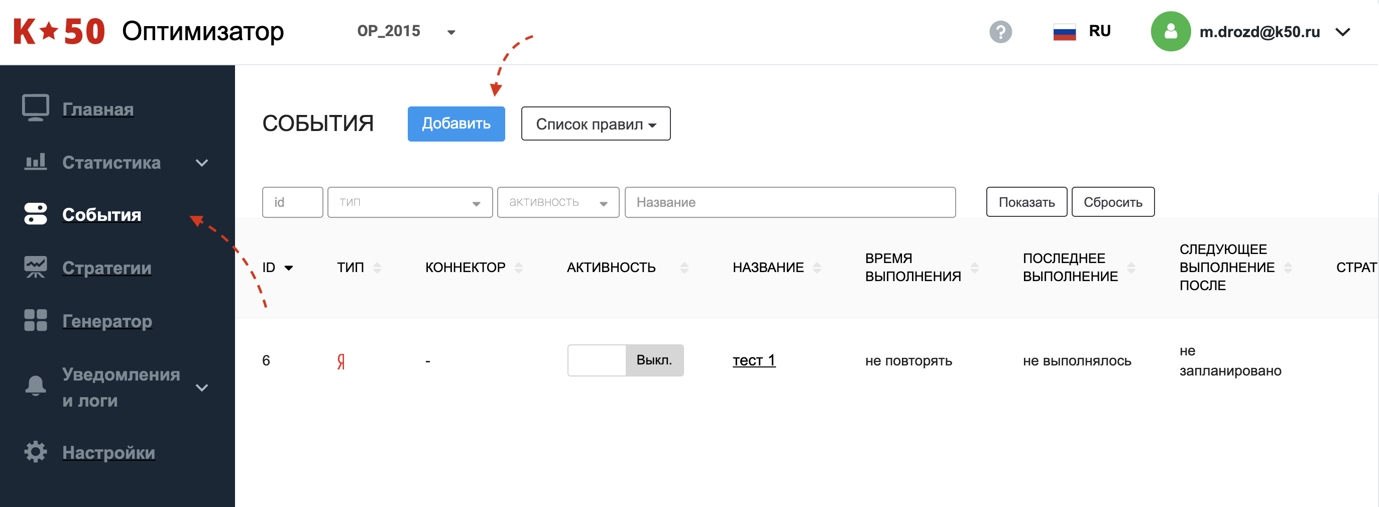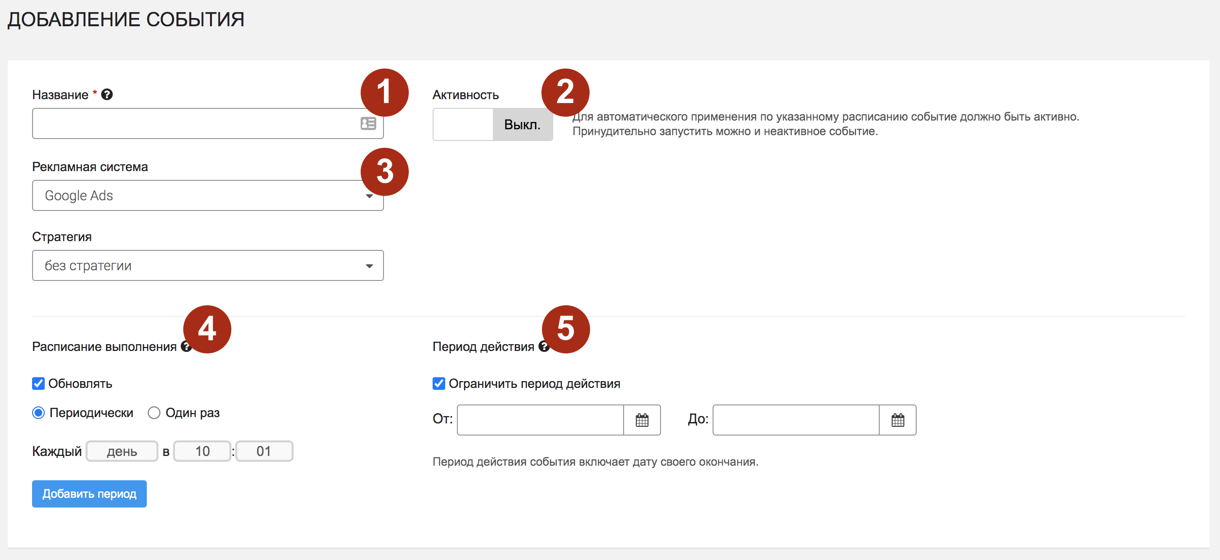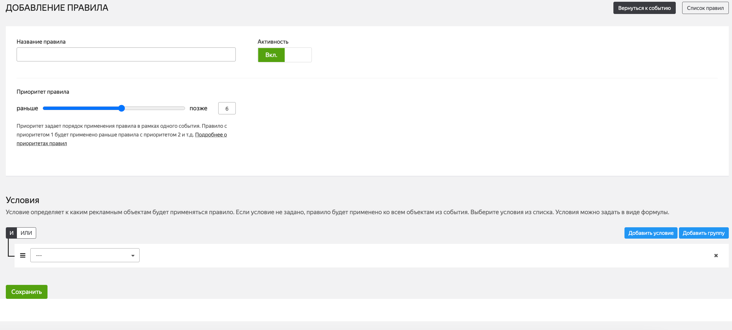 Мы рекомендуем сначала завести все настройки событий: название; периодичность; список кампаний, на которых данное событие будет выполняться. Затем сохранить их, а потом добавить Правило или выбрать его из предустановленных.