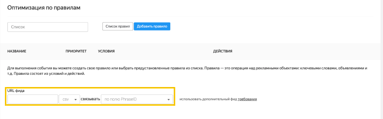 URL фида — ссылка на дополнительный фид. С помощью внешнего источника данных можно управлять кампаниями от маржинальности товаров и категорий, от стоимости товаров, а также актуализировать активность ручных рекламных объявлений и многое другое. Синхронизация возможна "по полю url" и "по полю PhraseID". Подробнее про подключение дополнительного фида — здесь.