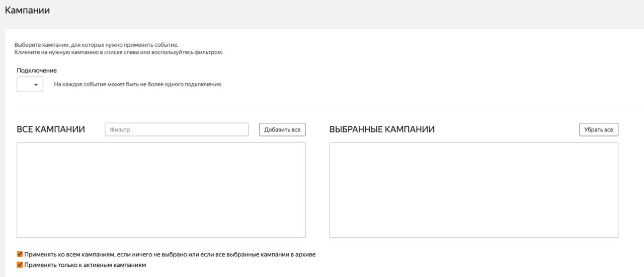 Кампании, для которых нужно применить событие. Кампании подтягиваются автоматически, если рекламная система подключена. Кликните на нужную кампанию в списке слева или воспользуйтесь фильтром.
