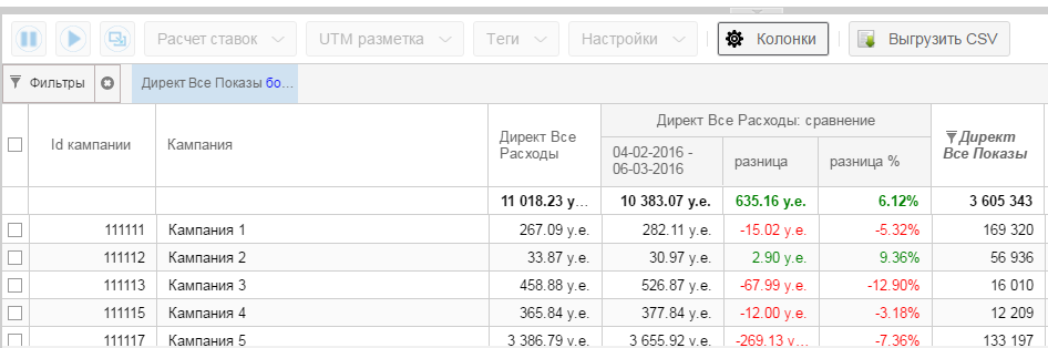 При активации сравнения для выбранного параметра появятся 3 дополнительных столбца: