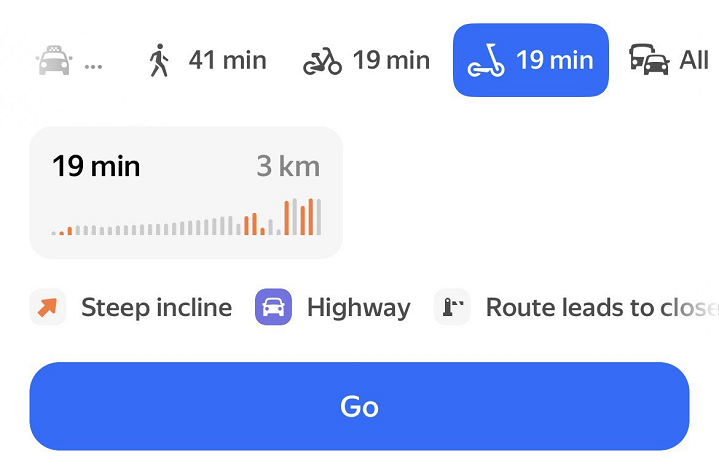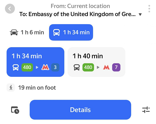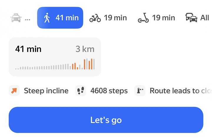 This is useful, for example, if your route starts far from the nearest metro station and it would take too long to walk or take the bus. Yandex Maps may suggest taking a taxi to the metro station, then continuing by public transport.