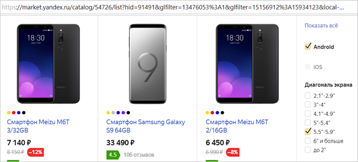 Откройте нужную категорию и выберите параметры фильтрации (например, операционная система Android, диагональ экрана 5.5"–5.9").