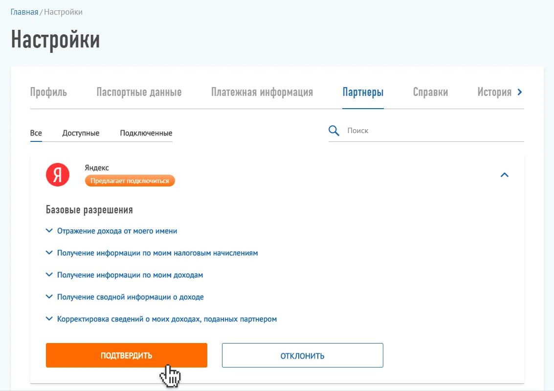 В разделе Настройки перейдите на вкладку Партнеры. Для ООО «ЯНДЕКС» нажмите кнопку Подтвердить, чтобы партнерская сеть получила доступ к базовым разрешениям.