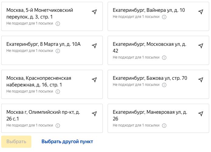 Не все пункты выдачи или почтовые отделения доступныЕсли одну или несколько посылок не получится доставить в выбранный пункт выдачи или почтовое отделение — вы увидите сообщение об этом при выборе способа доставки.Чтобы увидеть, какие посылки не получится доставить в конкретный пункт выдачи или почтовое отделение — нажмите значок
