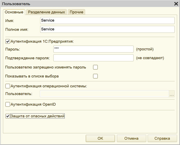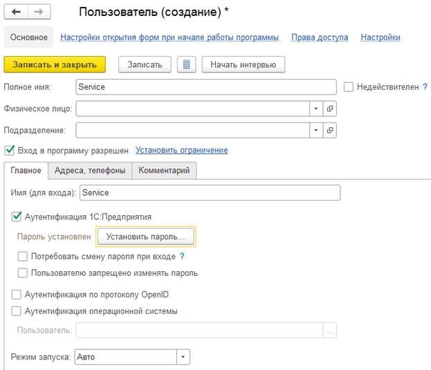 Введите данные пользователя, который будет использоваться для доступа к сервису.