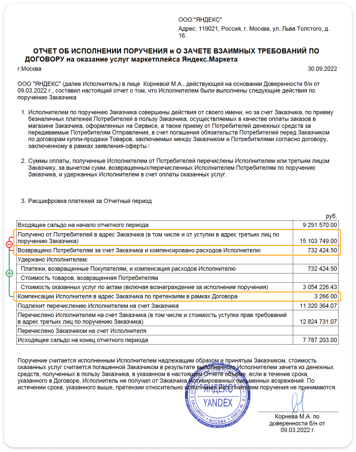 Перечислено Исполнителем на счет Заказчика. - Прибавить сумму за услуги Маркета — из строки Стоимость оказанных услуг по актам (включая вознаграждение за исполнение поручения).