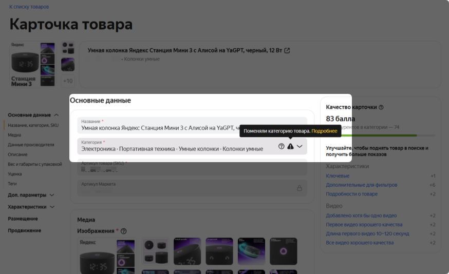 После смены категории запустится автоматическая проверка изменений. Если проверка обнаружит, что новая категория не соответствует товару, он может быть скрыт с витрины. Тогда поменяйте категорию вручную и еще раз отправьте на проверку.