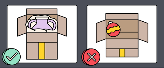 Складывайте товары так, чтобы они не повредились при доставке. Например, не кладите тяжелые товары поверх хрупких.