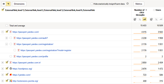 An external or outbound click is a click on a link with a domain that differs from the domain of the site where a Yandex Metrica tag is installed. Flash banners are not considered outbound links.