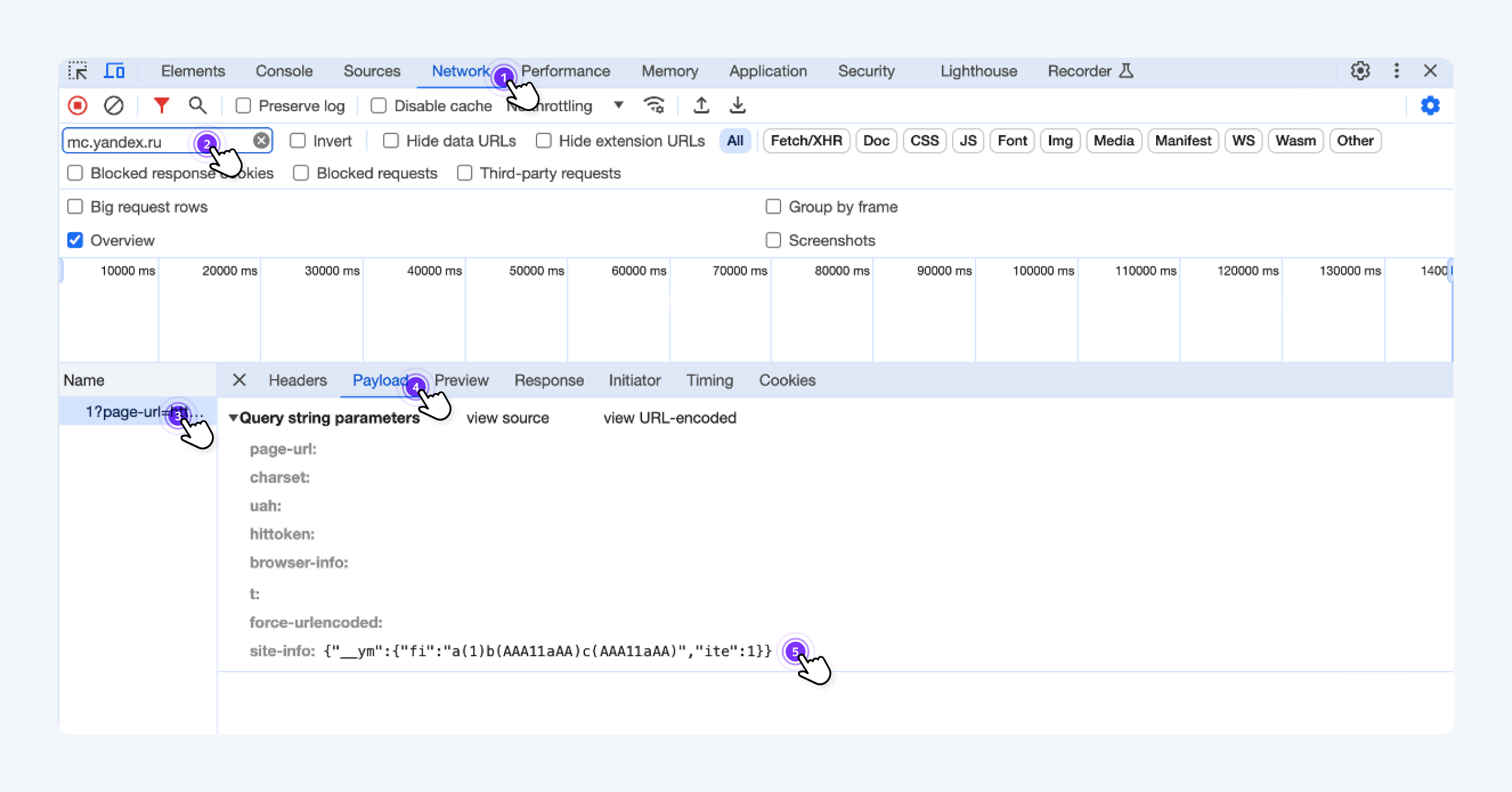 site-info: {“___ym”:{“fpp” …}parameter is present in the tab content, it means that you have found the correct request and data transfer is set up correctly. - If such a parameter is not present, open another request that starts with