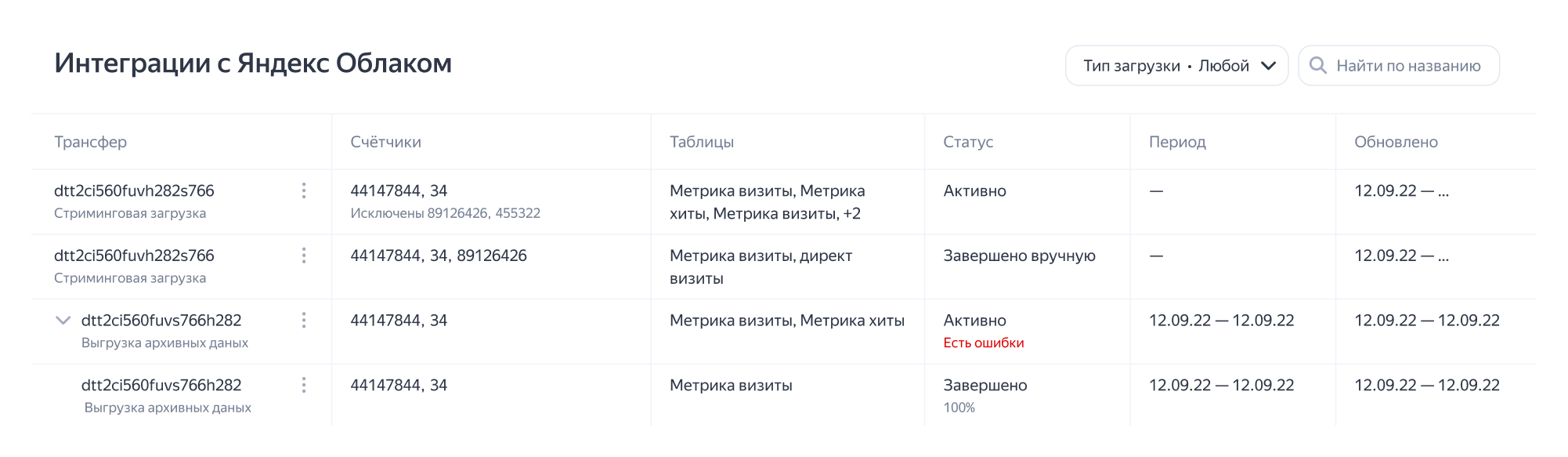 On the Cloud integration page, you can view your exports of the following two types: streaming uploads and archived data exports. For archived data exports, the completion percentage is displayed for each table. Exporting archived data for an extended period may take several days or longer.