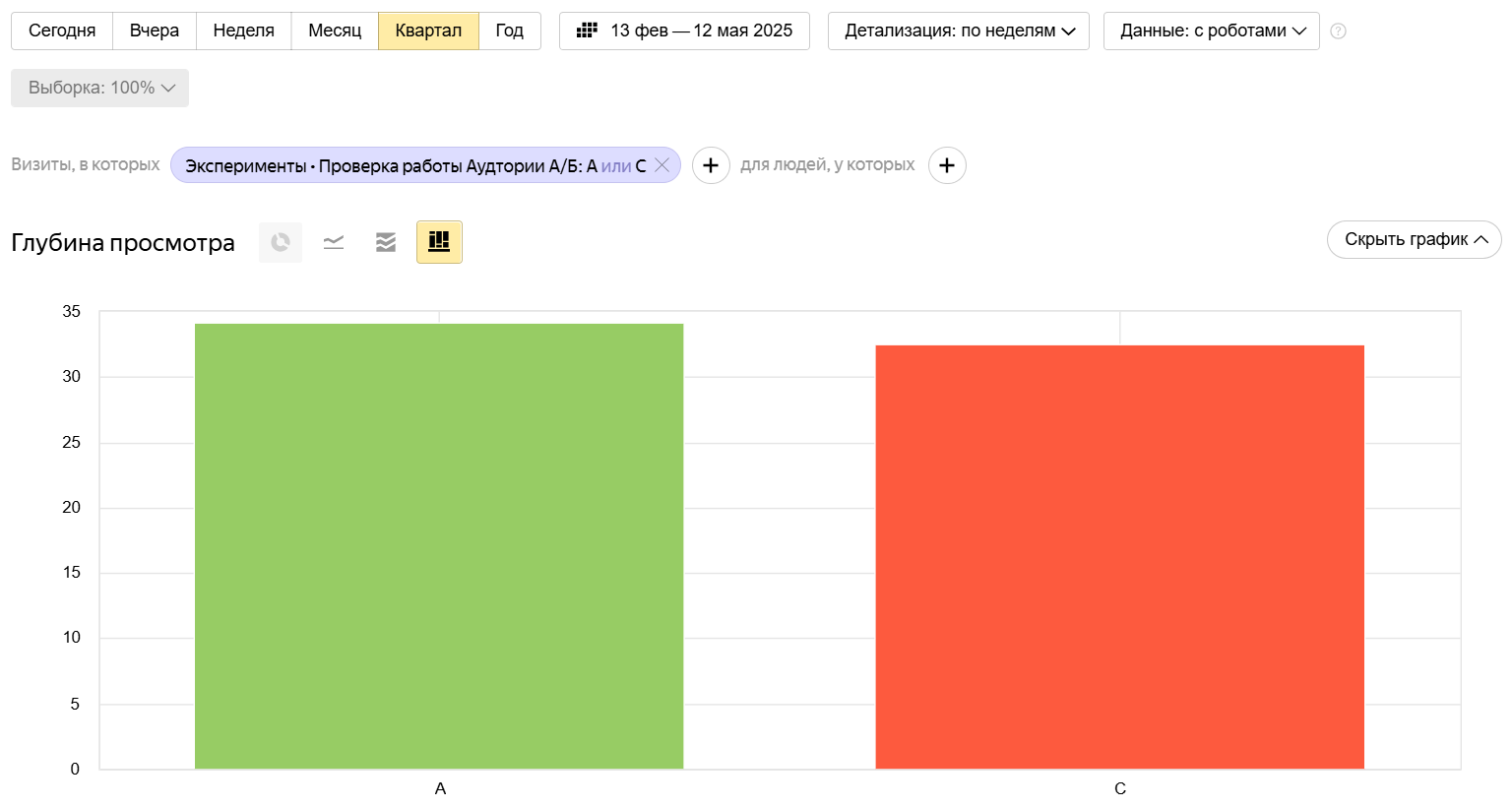 The name of the experiment is displayed as a grouping condition in Yandex Metrica. For example, you can view statistics on a campaign as part of an experiment.