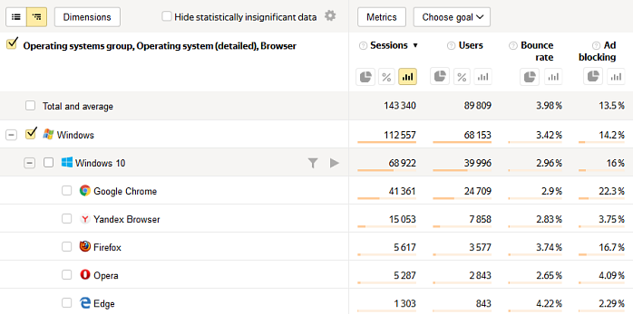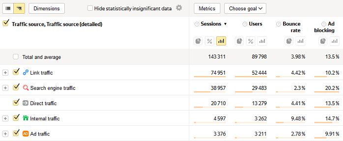 This report contains information about user sessions where a popular ad blocker was used, such as Adblock, Adblock Plus, Adguard, and uBlock. Some technologies may block the Yandex Metrica tag, so your statistics may be skewed towards the lower end.