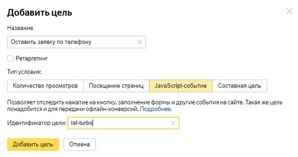 tel-turboin this example), and click Add goal. The created goal will appear in the list of goals. Yandex.Metrica will start collecting statistics on it within a few minutes.