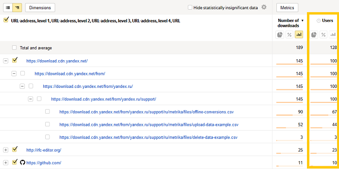Los datos del informe se agrupan por la dirección en que se ubica el archivo para su descarga.