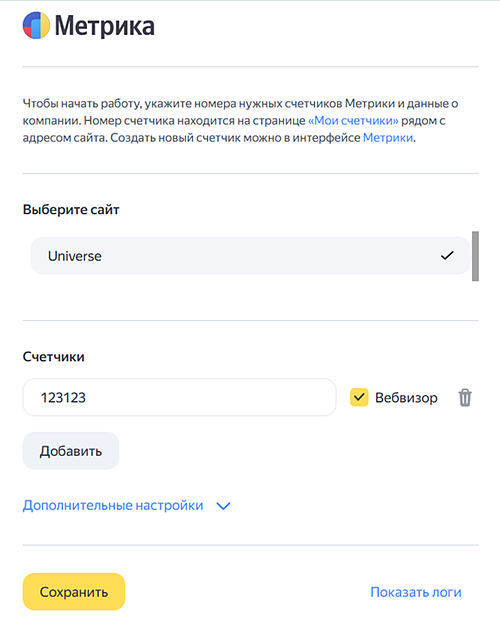 Ingrese el número de la etiqueta instalada en su sitio web. Si el plugin detecta una etiqueta de Yandex Metrica en el sitio web, los campos se llenarán automáticamente. Verifique si sus valores son correctos. Cómo encontrar el número de etiqueta
