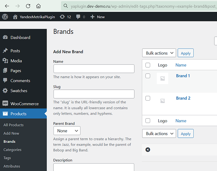 En WordPress, vaya a la página Productos → Marcas y observe la URL en la barra de direcciones del navegador: el parámetro