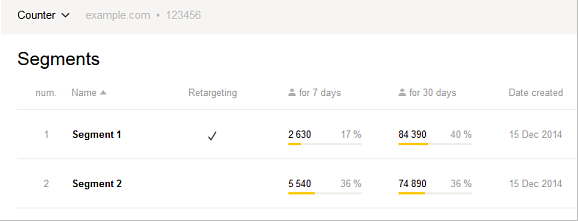Todos los segmentos que ha guardado están disponibles en la interfaz de Yandex Metrica, bajo Configuración → Segmentos. Esta sección muestra el número de usuarios en un segmento durante los últimos 7 y 30 días, y si el segmento se utiliza para listas de retargeting en Yandex Direct. Para obtener más información sobre las listas de retargeting, consulte Ayuda de Yandex Direct.