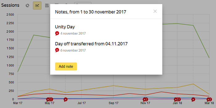 Os comentários ajudam a rastrear eventos importantes e entender como eles estão relacionados com oscilações nas estatísticas do site. Você pode criar suas próprias notas ou usar as notas predefinidas do Yandex Metrica.