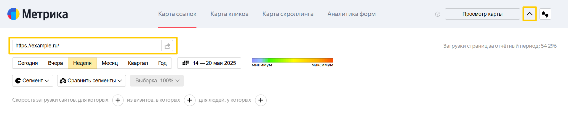 Карта будет отображена на наиболее популярной странице сайта, URL которой соответствует указанному условию. Числовые показатели (количество переходов по ссылке, доля переходов) будут являться объединенными для всех страниц, соответствующих условию.