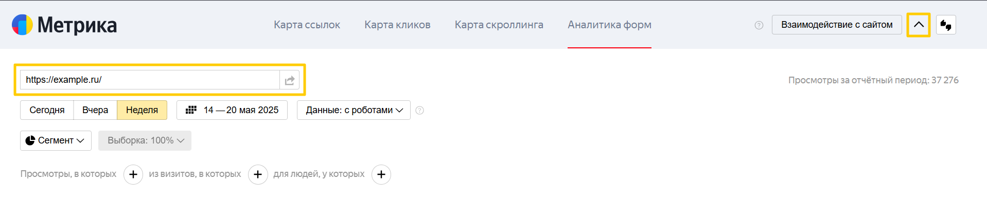Чтобы данные отобразились в аналитике форм, введем в поле адрес https://example.com/* (после ввода этот же адрес отобразится в выпадающей подсказке). Данные загрузятся автоматически и будут суммарными для всех страниц, на которых есть данная строка поиска.