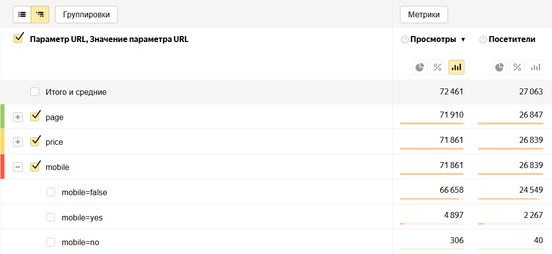 Отчет показывает статистику по параметрам URL страниц вашего сайта.