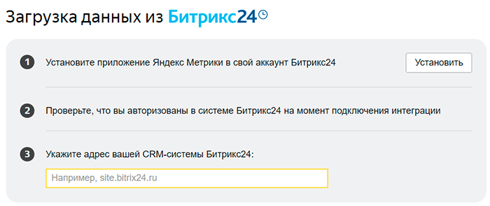 Вернитесь в Метрику на страницу Загрузка данных из Битрикс24 и укажите адрес вашей CRM-системы Битрикс24 в соответствующем поле.