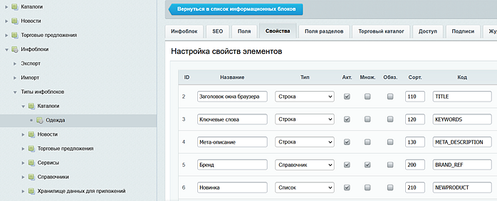 - Перейдите в раздел Контент → Типы инфоблоков → Каталоги и выберите каталог.