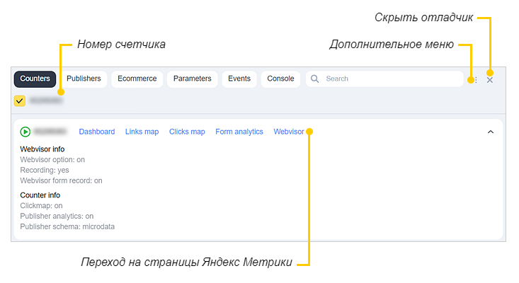 Чтобы закрыть отладчик, откройте дополнительное меню <sodipodi:namedview id="rnd-301f4070__namedview2803" pagecolor="#ffffff" bordercolor="#000000" borderopacity="0.25" inkscape:showpageshadow="2" inkscape:pageopacity="0.0" inkscape:pagecheckerboard="0" inkscape:deskcolor="#d1d1d1" showgrid="false" inkscape:zoom="25.732538" inkscape:cx="14.90331" inkscape:cy="8.5106257" inkscape:window-width="1920" inkscape:window-height="1017" inkscape:window-x="-8" inkscape:window-y="-8" inkscape:window-maximized="1" inkscape:current-layer="i-ua1"/> и нажмите Close debugger. Также отладчик можно закрыть, добавив в URL страницы параметр ?_ym_debug=0.