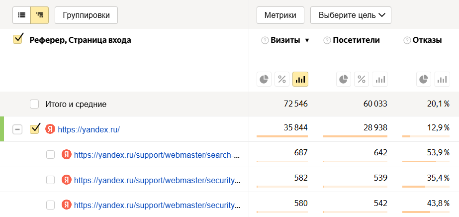Таким образом, мы получили информацию о страницах, с которых начался визит. Чтобы определить откуда произошел переход на эти страницы, добавим группировку по рефереру (источнику) начала визита: