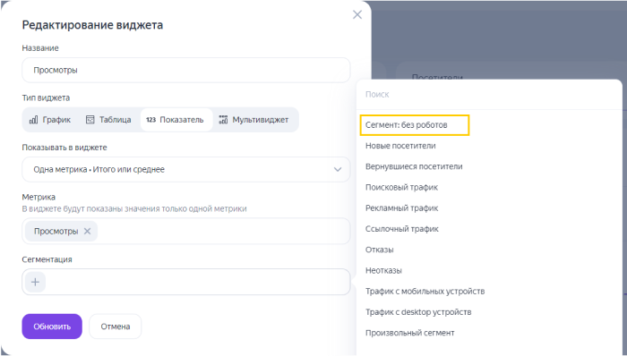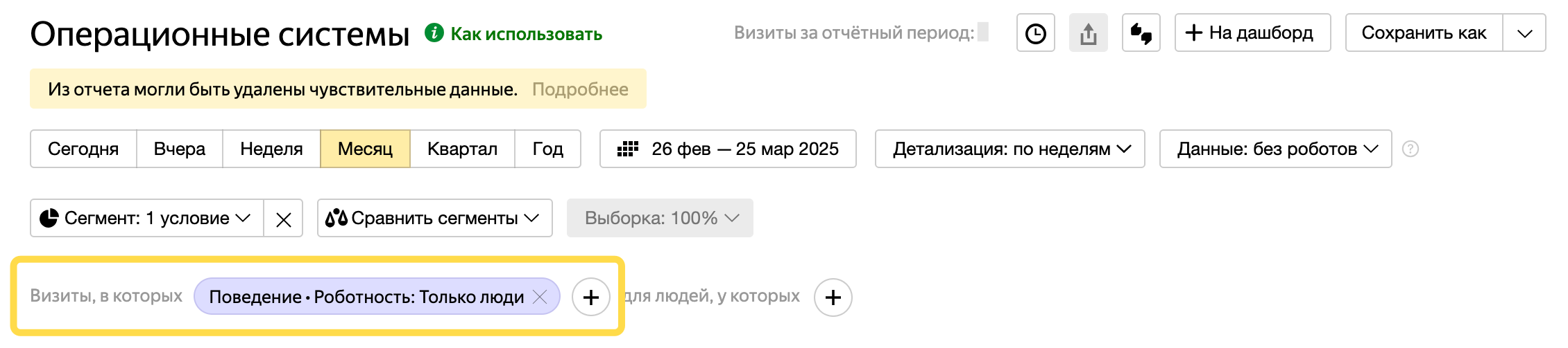 Botları davranışa göre filtrelemeyi, Yandex Metrica Logs API’sini kullanıyorsanız ve botsuz toplu olmayan verilere ihtiyacınız varsa kullanabilirsiniz. Diğer durumlarda, aşağıda açıklandığı şekilde raporlardaki verilerin görüntülenme modunu değiştirin.