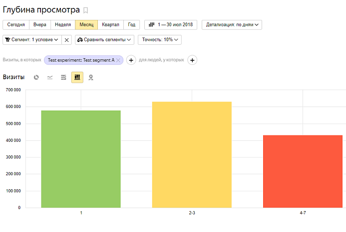 Yandex Audience'ta oluşturulan segment Yandex Metrica'da segmentasyon koşulu olarak yansıtılır. Örneğin, sadece seçilen deney segmentini ziyaret eden ziyaretçilere ait görüntüleme derinliğini görebilirsiniz.