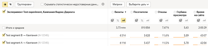 Yandex Metrica'da deney adı boyut koşulu olarak yansıtılır. Örneğin, deneme kapsamında kampanya istatistiklerini görüntüleyebilirsiniz.