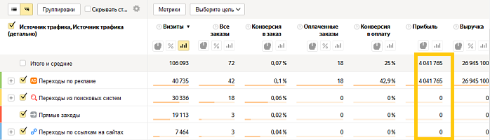 Gelir ile maliyet arasındaki fark. Kâr miktarı hesaplanırken Yandex Metrica'daki ziyaretlerle ilişkilendirilemeyen siparişler dikkate alınmaz. |